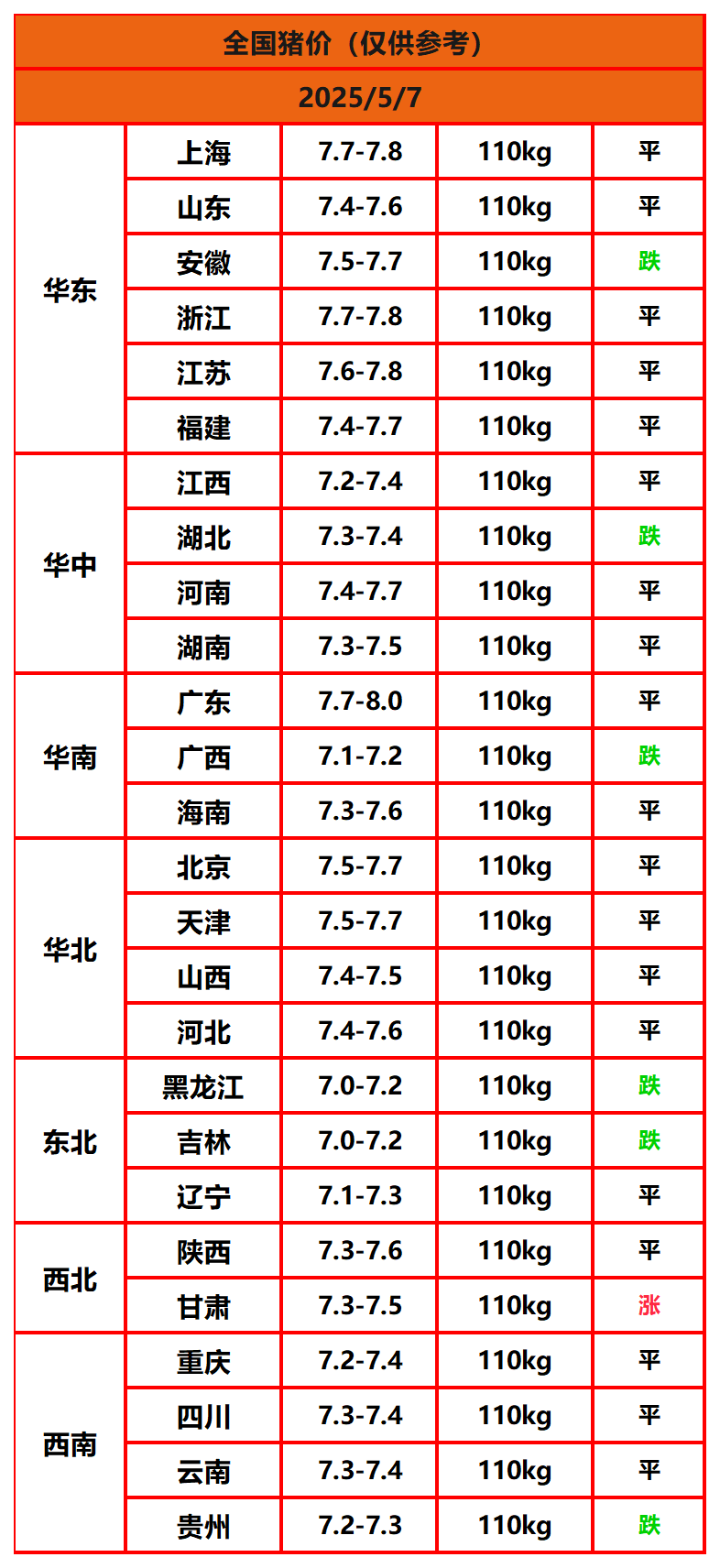 2025年5月7日猪价,今日全国猪价行情走势:1涨6平19跌。