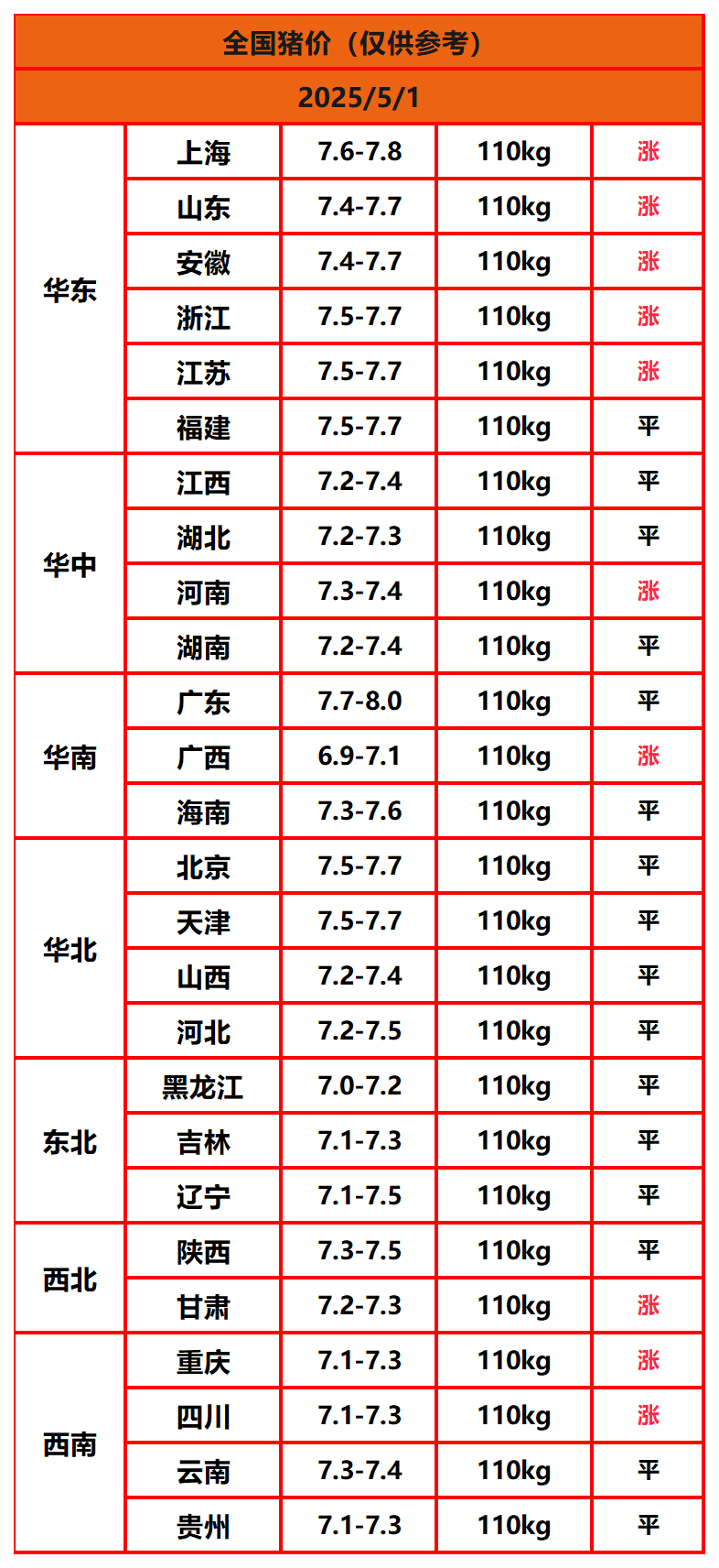 2025年5月1日猪价,今日全国猪价行情走势:10涨16平0跌。